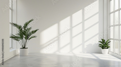 A sunlit, minimalist, empty room with potted plants and large windows, showcasing natural light and shadows.