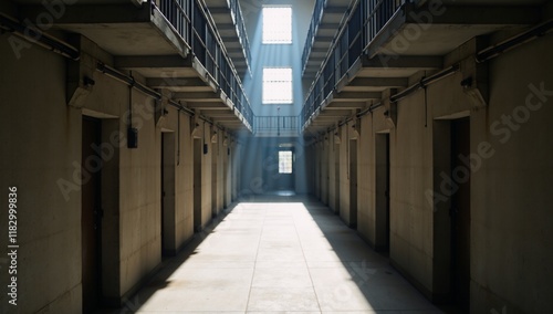 A sunlit prison hall exhibits rows of confined cells during a lockdown