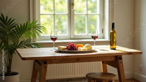 A sunlit table setting with wine, cheese, and grapes, perfect for a relaxing afternoon