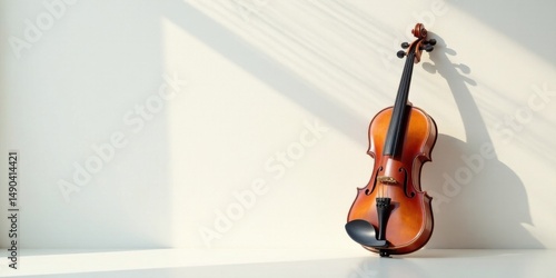 A sunlit violin rests elegantly against a pale wall, casting a gentle shadow; a scene of quiet musical contemplation.