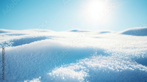 A sunlit winter landscape showcasing an expansive blanket of fresh snow under a clear blue sky