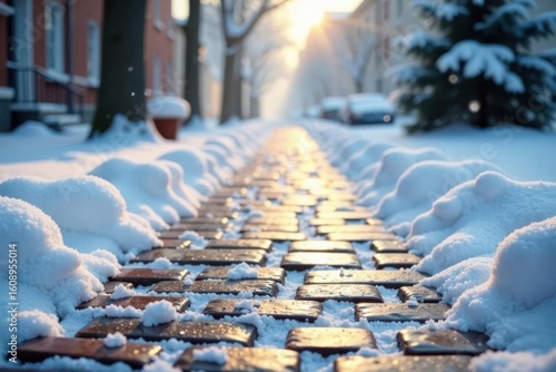 A sunlit winter morning path, snow-dusted cobblestones reflecting golden hour light, tranquil snowy scene, quiet neighborhood street