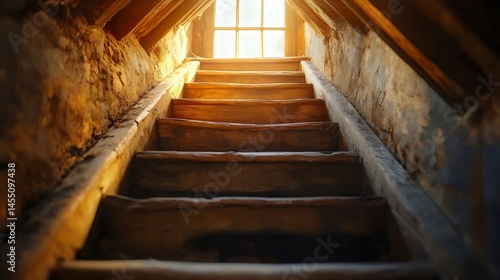 A sunlit wooden staircase ascends to a bright window within an old, rustic building's interior.