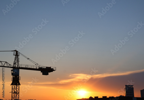 A sunset over the horizon, with delicate shades of orange and bluish, as the sun dips below the horizon. Clouds create serenity and drama to the scene. Crane on a front view