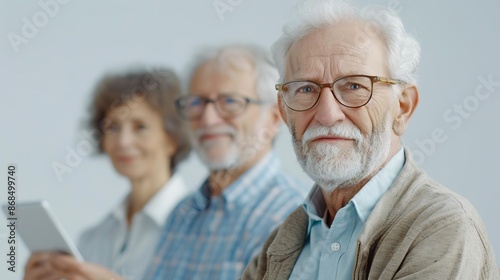 A super sharp image of a group of older adults hiking with trekking poles and wearing high-tech outdoor gear