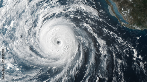 A super typhoon, characterized by fierce winds and swirling clouds, moves across the ocean toward land.