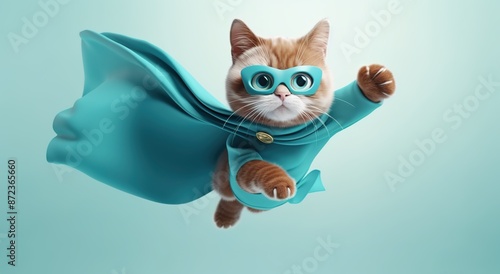 A superhero cat, depicted as an adorable orange tabby feline wearing a blue cloak and mask, is shown jumping and flying against a light blue backdrop with ample space for text.