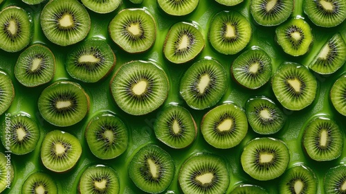 A surface densely covered with whole and sliced kiwi fruit, filling every inch of the frame with their vibrant green color and juicy texture.