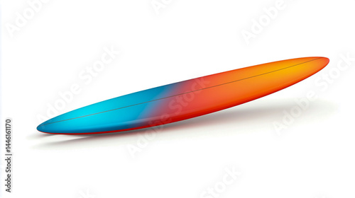 A surfboard with a gradient of red, orange, and blue colors, isolated on a white background. Photorealistic image