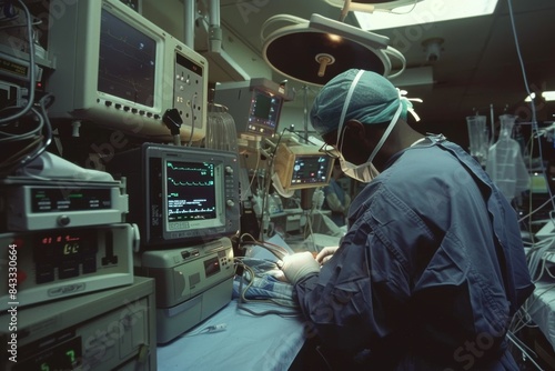 A surgeon in the middle of a procedure, surrounded by beeping monitors and sterile equipment