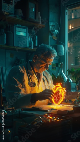 A surgeon operates on a glowing heart in a dimly lit room.