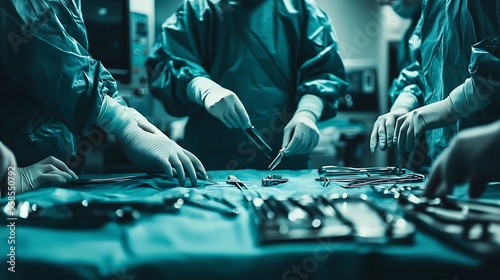 A surgical team preparing for a major operation, with sterile equipment laid out, focusing on precision and teamwork in the operating theater.