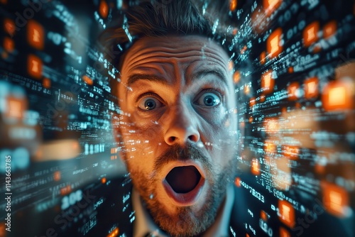 A surprised man appears amidst a digital backdrop, conveying a sense of shock and awe, emphasizing the impact of technology.