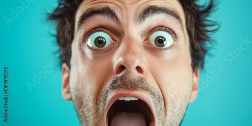 A surprised man's face with wide-open eyes reflects an intense moment of awe or shock on a blue background.