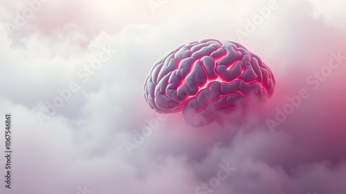 A surreal brain with a dreamy landscape of fog and mist surrounding it, with soft pink and purple hues, neural dreamscape, artistic expression