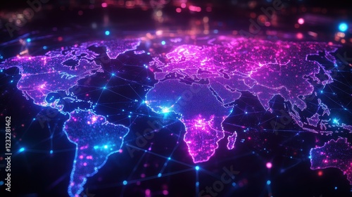 A surreal cyberpunk-style world map with neon trade routes forming an intricate spiderweb of global commerce, set in deep purple and electric blue tones.