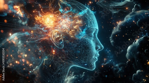 A surreal depiction of a human silhouette intertwined with cosmic elements.