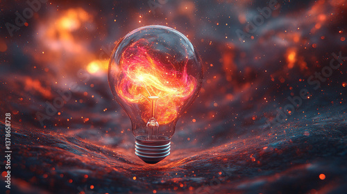 A surreal floating lightbulb filled with a swirling cosmos and nebulae, emanating rainbow light waves and creative energy, symbolizing innovation, imagination, and limitless potential