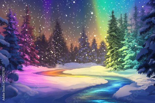 A surreal holiday landscape with a rainbow aurora borealis shining over a snow covered forest, casting multicolored lights on the icy ground.