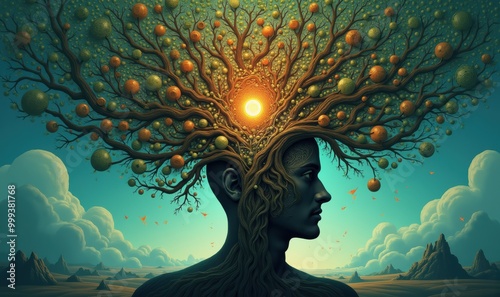 A surreal illustration of a human figure with a tree-like head, symbolizing growth, creativity, and interconnectedness. Ideal for wellness, creativity, and environmental themes.