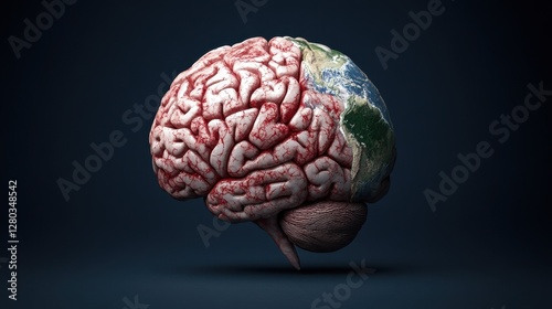 A surreal image depicting a brain seamlessly merging with a globe, symbolizing the connection between human thought and the world.