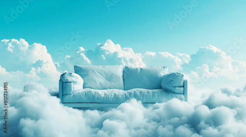 A surreal image of a blue sofa floating amongst fluffy white clouds against a clear sky.