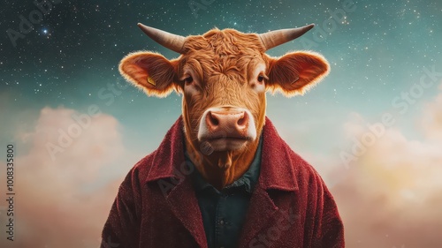 A surreal image of a cow with a human-like expression, wearing a coat against a dreamy, starry background.