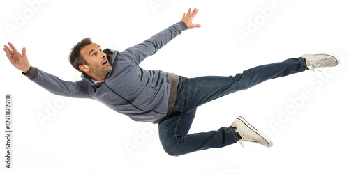 A Surreal Image of a Man Floating in Mid-Air Isolated on a White Background for Creative Expression