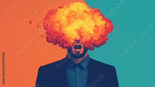 A surreal image of a man in a suit with a vibrant explosion for a head, symbolizing intense emotions or thoughts.
