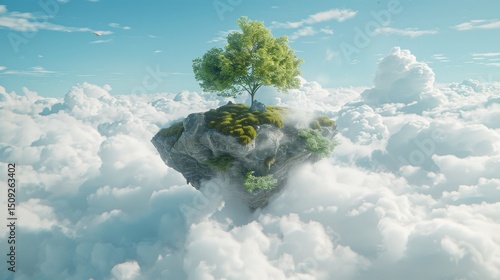 A surreal island suspended in the sky, hovering above a sea of fluffy white clouds
