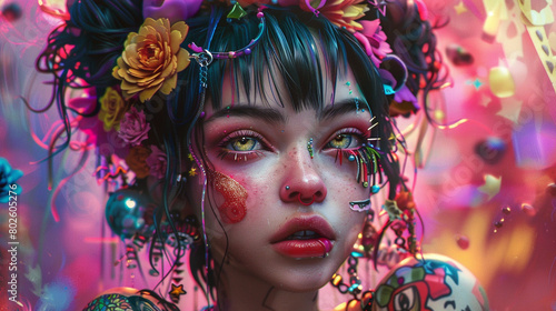 A surreal portrait of a character embodying punk rock spirit, with candy-themed accessories, floral tattoos, and subtle animalistic features, against a backdrop of vibrant colors a