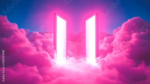 A surreal scene featuring two glowing doors framed by vibrant pink clouds against a blue sky, This image can be used for themes of transformation, dreams, or alternate realities in creative projects,