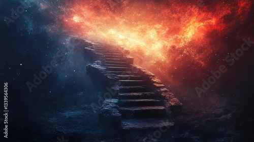A surreal staircase leading to a fractured sky, symbolizing the journey through a broken mind