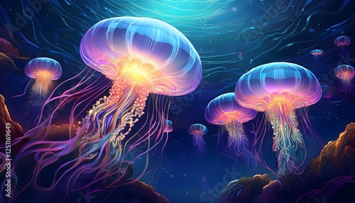 A surreal underwater wallpaper featuring glowing, bioluminescent jellyfish.