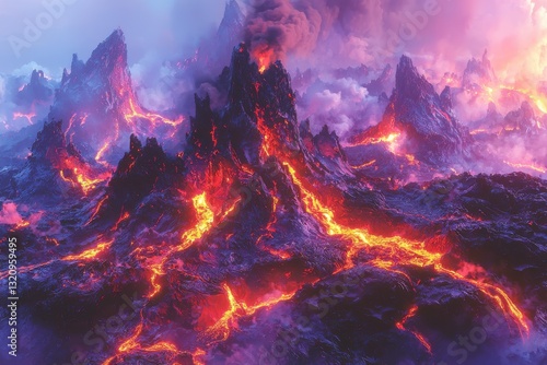A surreal volcanic landscape with flowing lava and vibrant purple clouds, showcasing a fiery otherworldly scene of natural power and beauty.
