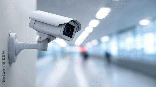 A surveillance camera is mounted in a brightly lit hallway for security monitoring.