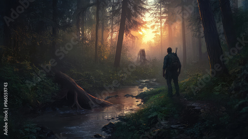 A survivor in a forest at dawn, standing near a small creek. The trees are dense, and distant zombie growls can be heard. Sunlight filters through the branches.