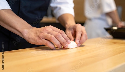 A sushi chef preparing a piece of sushi at a restaurant. The chef is focused, crafting with a precise, professional approach