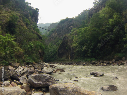 A suspended bridge over the river in the valley of the Himalayan mountains