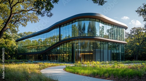 A sustainable glass office building surrounded by lush green trees, showcasing eco-friendly design and modern architecture for corporate spaces.