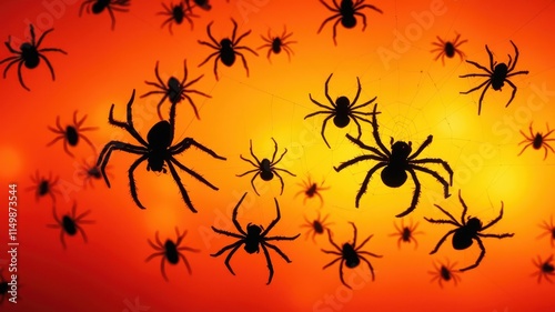 A Swarm of Silhouettes Arachnids on an Orange Background