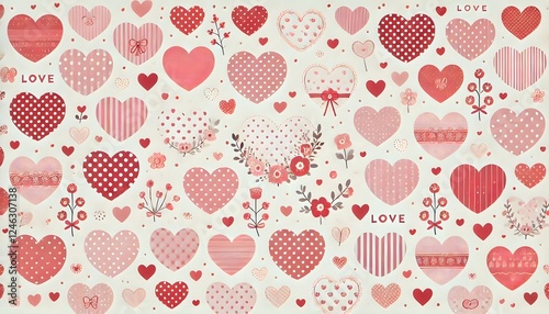 A sweet and simple love wallpaper with a series of red and pink hearts in various sizes, some filled with patterns like polka dots, stripes, and lace