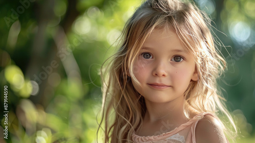 A sweet little girl is posing for a picture outside. The background is a lush green color.