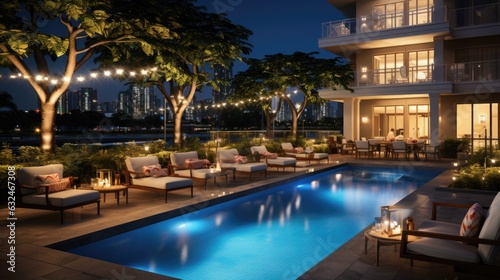 A swimming pool with lounge chairs around it at night. AI.