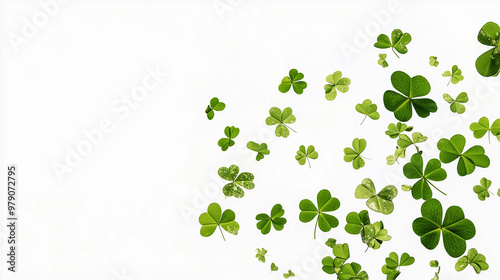 A swirl of four leaf clovers dancing gracefully in the air against a bright white background