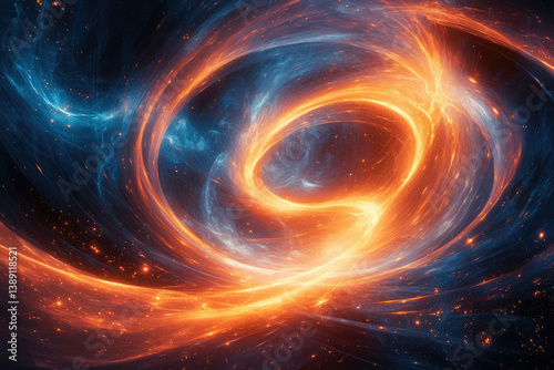 A swirling cosmic nebula with vibrant orange and blue energy streams, resembling a fiery vortex in space.