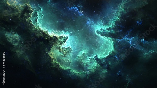 A swirling green nebula with blue hues and twinkling white stars in a dark background.