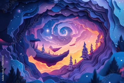 A swirling paper - cut galaxy with floating islands, shimmering stars, and ethereal cosmic creatures
