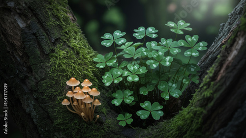 A Symbiotic Dance of Nature's Bounty: A close-up shot showcasing delicate, verdant clover and a cluster of mushrooms thrives in harmony on an old tree branch.