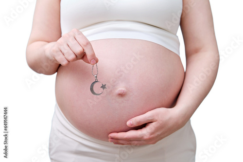 A symbol of the Muslim religion in the hands of a pregnant woman, a studio photo, isolated on a white background